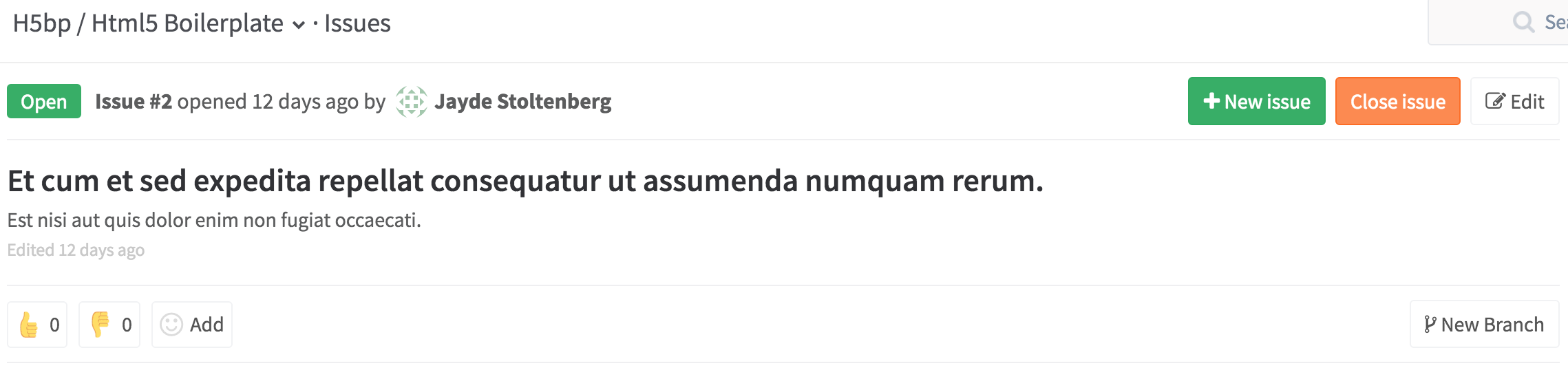 Once you click it, a new branch will be created that diverges from the default branch of your project, by default master. The branch name will be based on the title of the issue and as suffix it will have its ID. Thus, the example screenshot above will yield a branch named 2-et-cum-et-sed-expedita-repellat-consequatur-ut-assumenda-numquam-rerum.